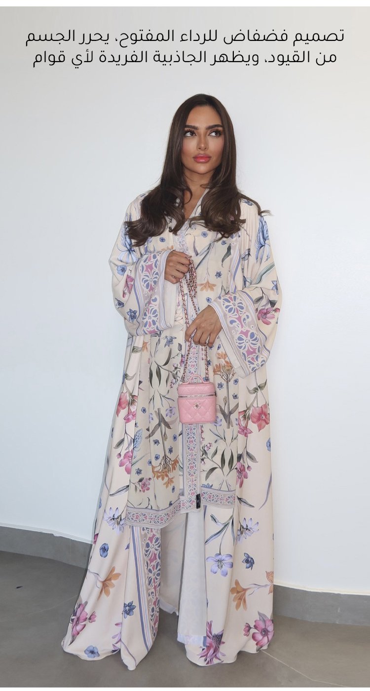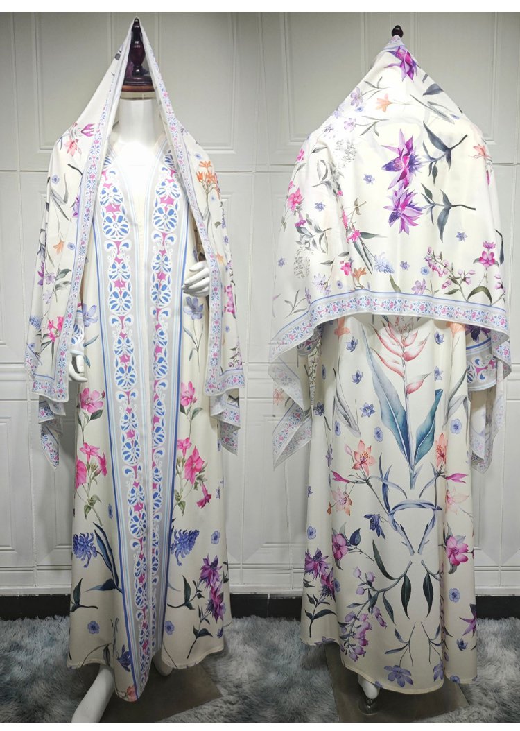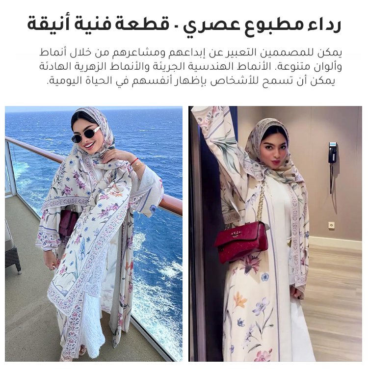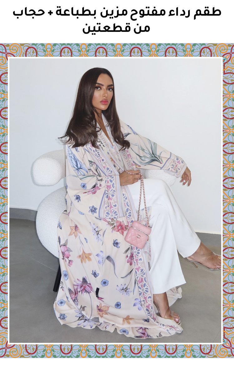 طقم رداء مفتوح مزين بطباعة وحجاب من قطعتين